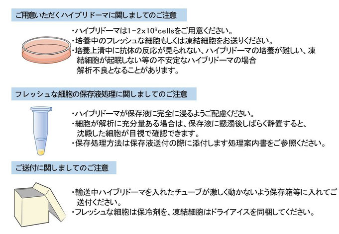 弊社よりハイブリドーマ保存液と保存処理案内書をお送りいたします。
